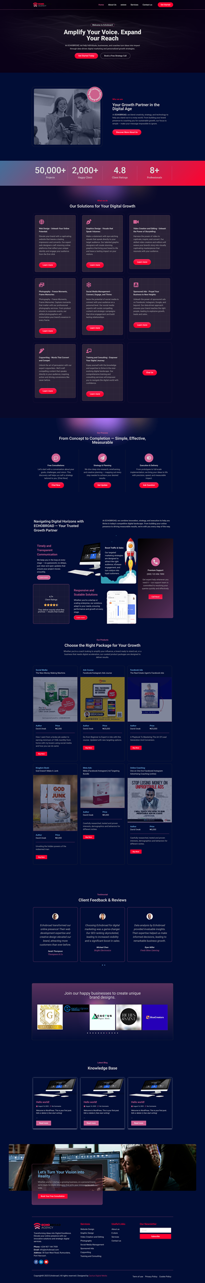 Purpose: To design and develop a visually striking, conversion-focused website that effectively communicates Echobroad Agency’s services, including branding, digital marketing, content creation, consulting, advertising solutions, and growth strategies. The goal was to create a platform that reflects trust, professionalism, and innovation.